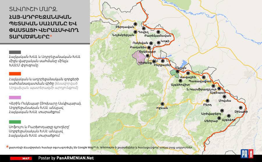 По совокупности сообщений СМИ и не только, складывается такая картина. Граница Армении и Азербайджана не везде проходит там, где она проходила в советское время. На границе в районе Тавуша с армянской стороны и Газаха с азербайджанской немало мест, где Азербайджан продвинулся в начале 1990-ых. Вот как граница выглядит сейчас – это карта Panarmenian.net от 2015 года.