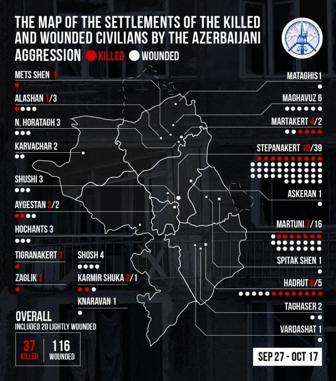 Согласно докладу омбудсмена Арцаха, на 17 октября, было убито 37 мирных жителей, в том числе 8 женщин. Из них 21 погибли дома, 4 на работе, 12 в других местах. Число людей, получивших тяжелые ранения – 96, в том числе 18 женщин. Из них 55 – дома, 6 в транспорте или убежище, 12 на работе, 23 в других общественных местах. Еще 20 мирных жителей получили легкие ранения.