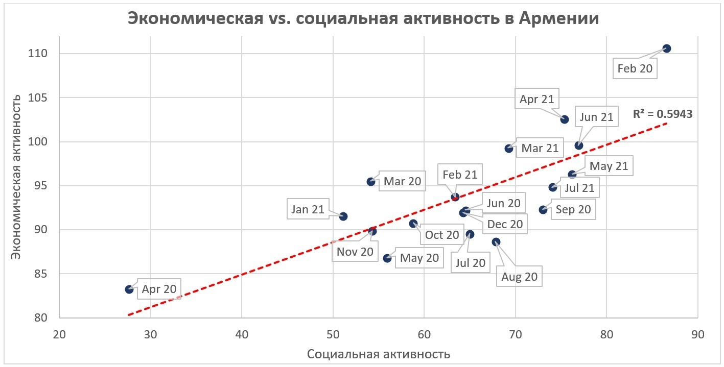 Примечание: каждая точка соответствует одному месяцу. Стоит учитывать, что данный расчет условен, поскольку данные по социальной активности доступны только по Еревану (порядка 57% ВВП Армении и 36% постоянного населения), тогда как по экономической активности – по всей Армении. В особенности большое отклонение это может давать в летние месяцы из-за сельского хозяйства. Экономическая активность рассчитана как темпы прироста к соответствующему месяцу 2019 года. Хотя выбор 2019 года в качестве базовой линии и является в некотором роде случайным, 2019 год был сбалансированным с точки зрения сезонности, без резких колебаний и политических событий, значительно повлиявших на соотношение между месяцами, в нем не было. Источник: расчеты автора на основе Индекса самоизоляции и Индекса активности