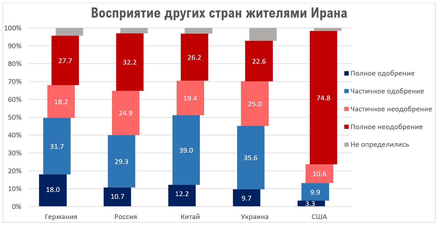 Причем первые два являются самыми главными. Если в конечном счете иранцы придут к выводу о тупиковости нынешней модели развития, то это рано или поздно скажется и на внешней политике. Поэтому интересно, как эволюционирует внешнеполитическое восприятие иранцев. При этом, дискуссионным следует считать вопрос о том, существуют ли в Иране подспудные проамериканские настроения или некое «второе дно» в общественном мнении? Из советского опыта мы знаем, что такое там было, и учитывая определенную схожесть систем, нельзя исключать, что и в Иране такие настроения могут нарастать на фоне ухудшения экономической ситуации. Однако на данный момент 85% населения плохо относятся к США и я сомневаюсь, что подобные результаты могли бы быть получены на опросах в СССР. К Германии и Украине, по крайней мере, люди не постеснялись высказать положительное отношение. Отношение к другим государствам выглядит следующим образом.