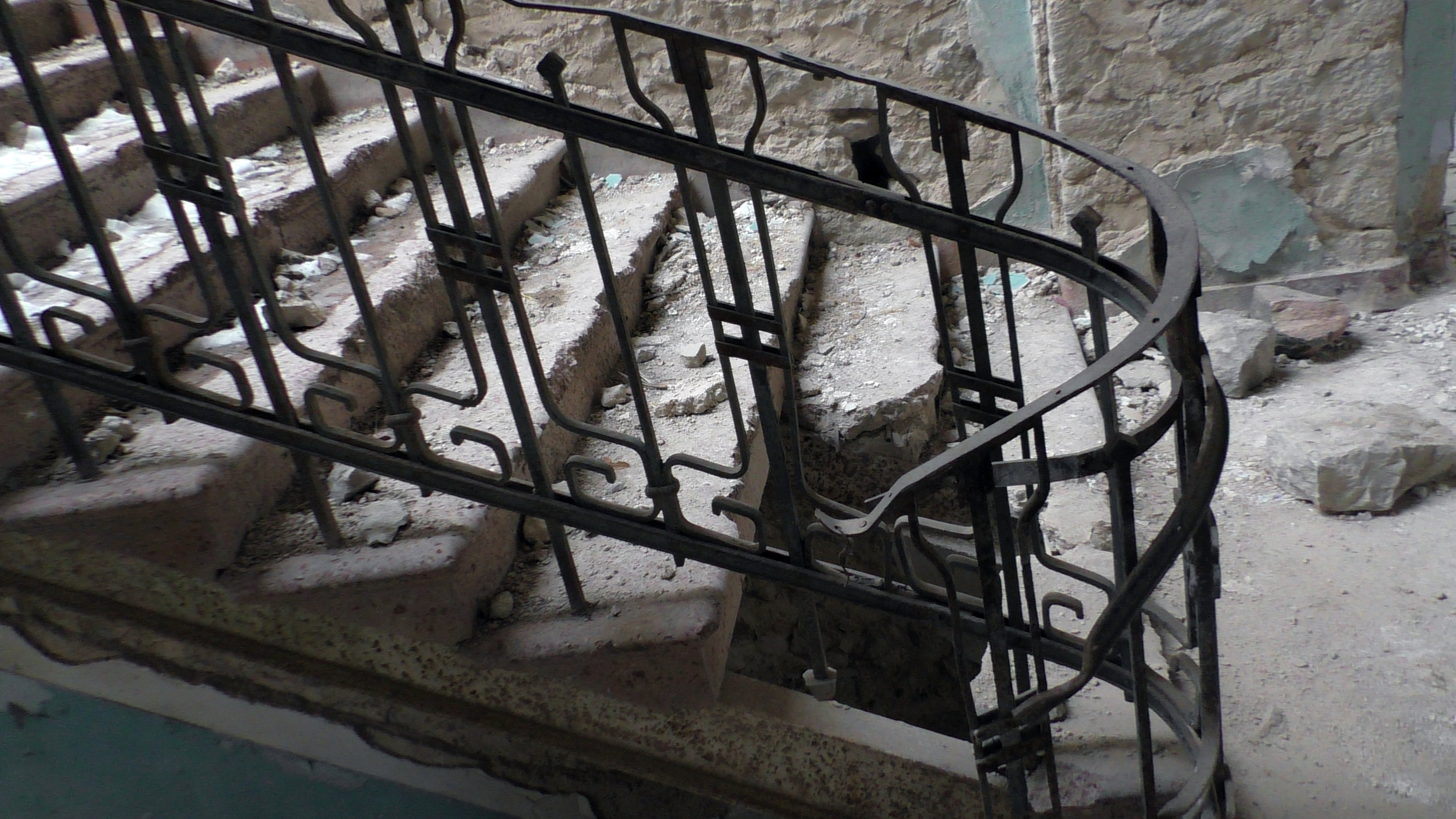 Кованные перила лестницы - вот и все, что внутри осталось от былого величия.