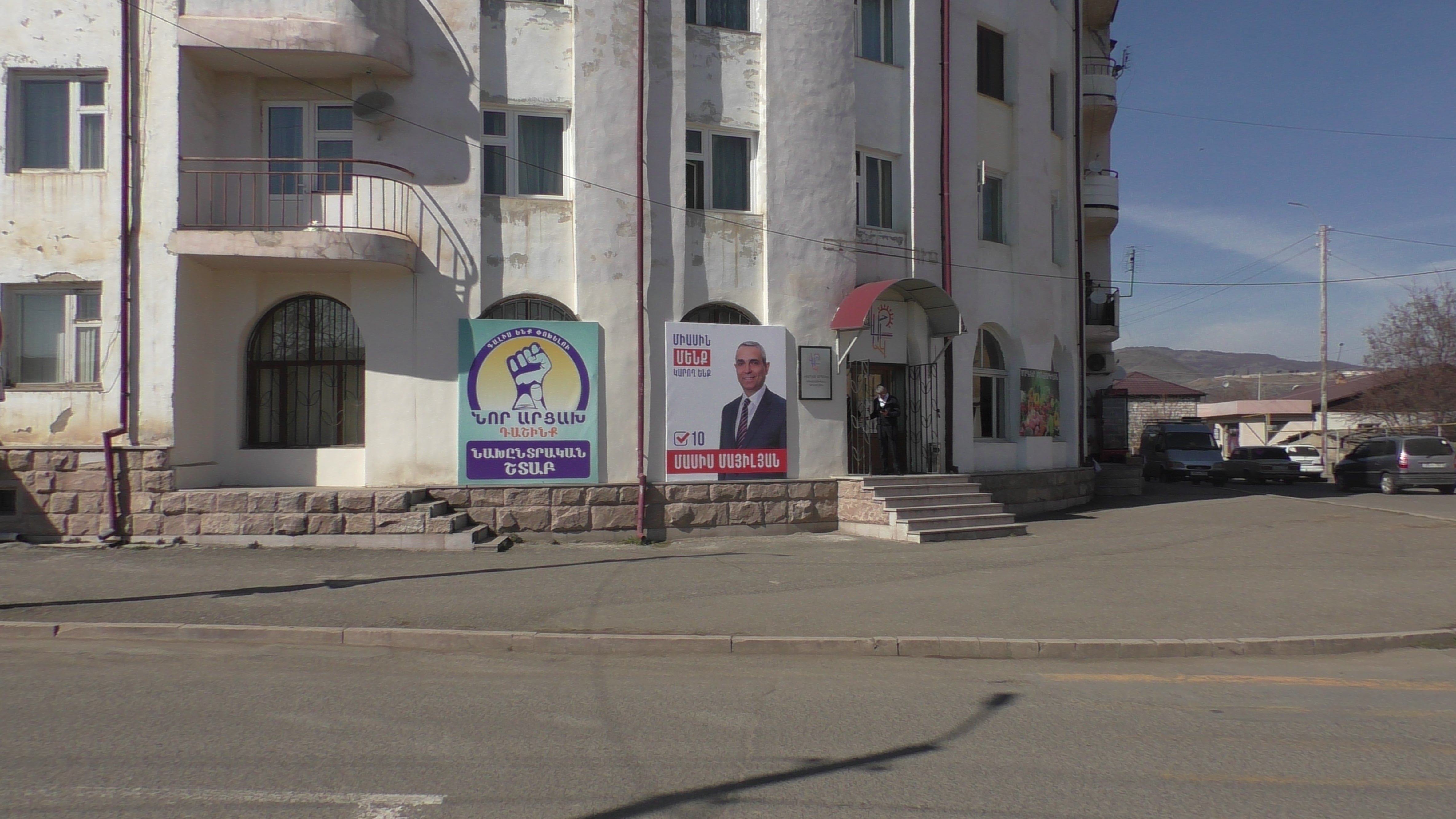 Больше всех денег у Араика Арутюняна, соответственно его плакат самый большой. Это рядом с вокзалом. Наши таксисты в своем большинстве за него, верят, что он станет президентом и улучшит жизнь всех жителей Арцаха. Интересно, если вдруг станет президентом, вспомнит ли о таксистах?