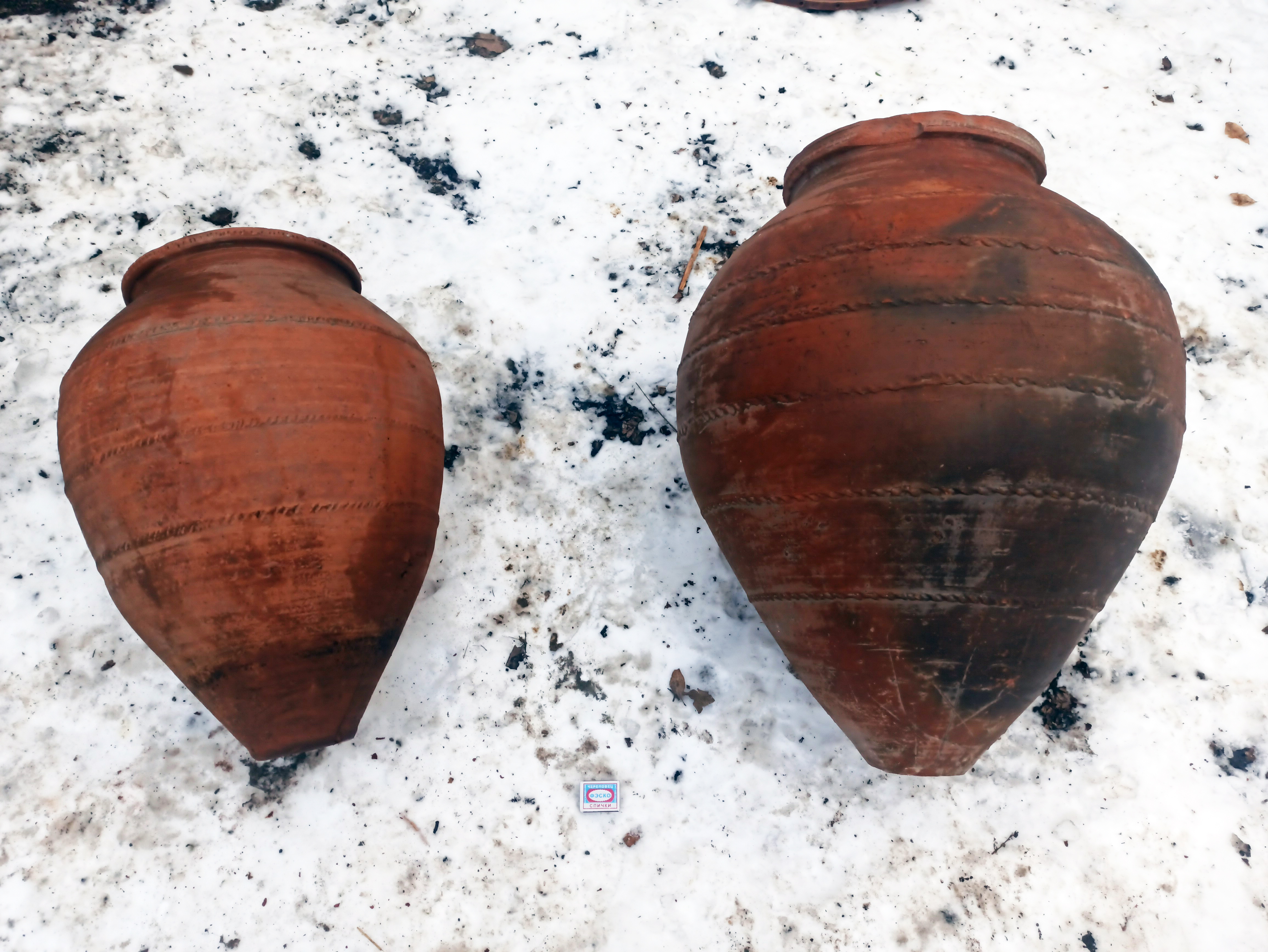 Два караса чуть поменьше, справа из села Сарушен, дед нам отдал, моя мать в этом карасе соления держала, нам на всю зиму хватало. Справа - из села Гер-Гер, рода Чалюнц, тоже для хранения вина (литров 150 вместится), рассказывал, когда мне его подарили.