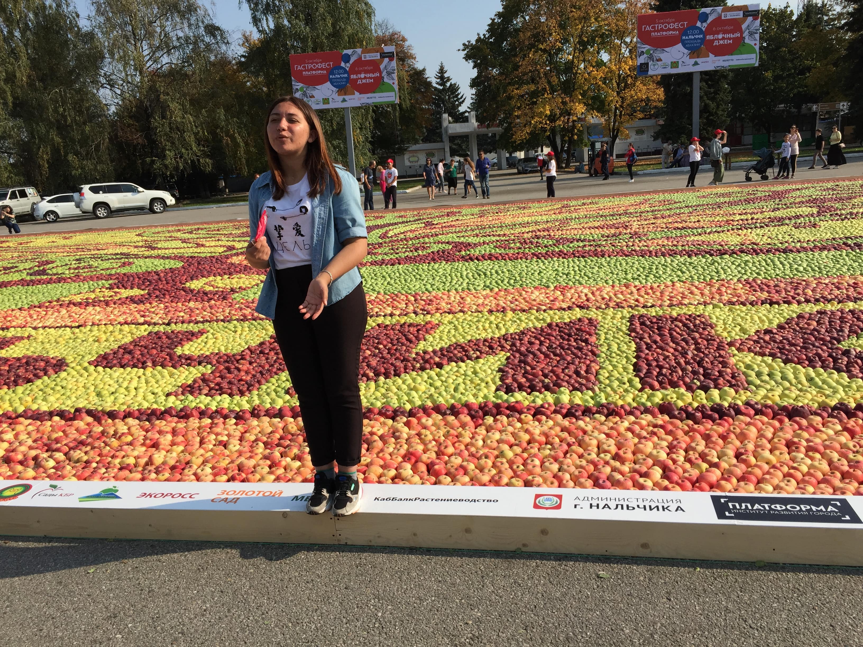Второй день гастрофестиваля был посвящен яблоку – традиционному для Кабардино-Балкарии фрукту. Продавались как сами яблоки разных сортов, так и изделия из них – пироги, булочки и слойки с яблоками. Ну и кульминацией фестиваля стало панно из яблок, названное «Древо жизни». 40 тонн красивых крупных яблок разных цветов были выложены на площади размером в 1020 кв. м. Получился орнамент в виде дерева с надписью «Нальчик». Панно три дня складывали волонтеры КБГУ. После фестиваля эти яблоки передадут в больницы, детские дома и интернат для пожилых одиноких людей.