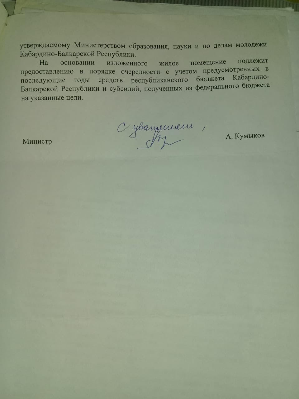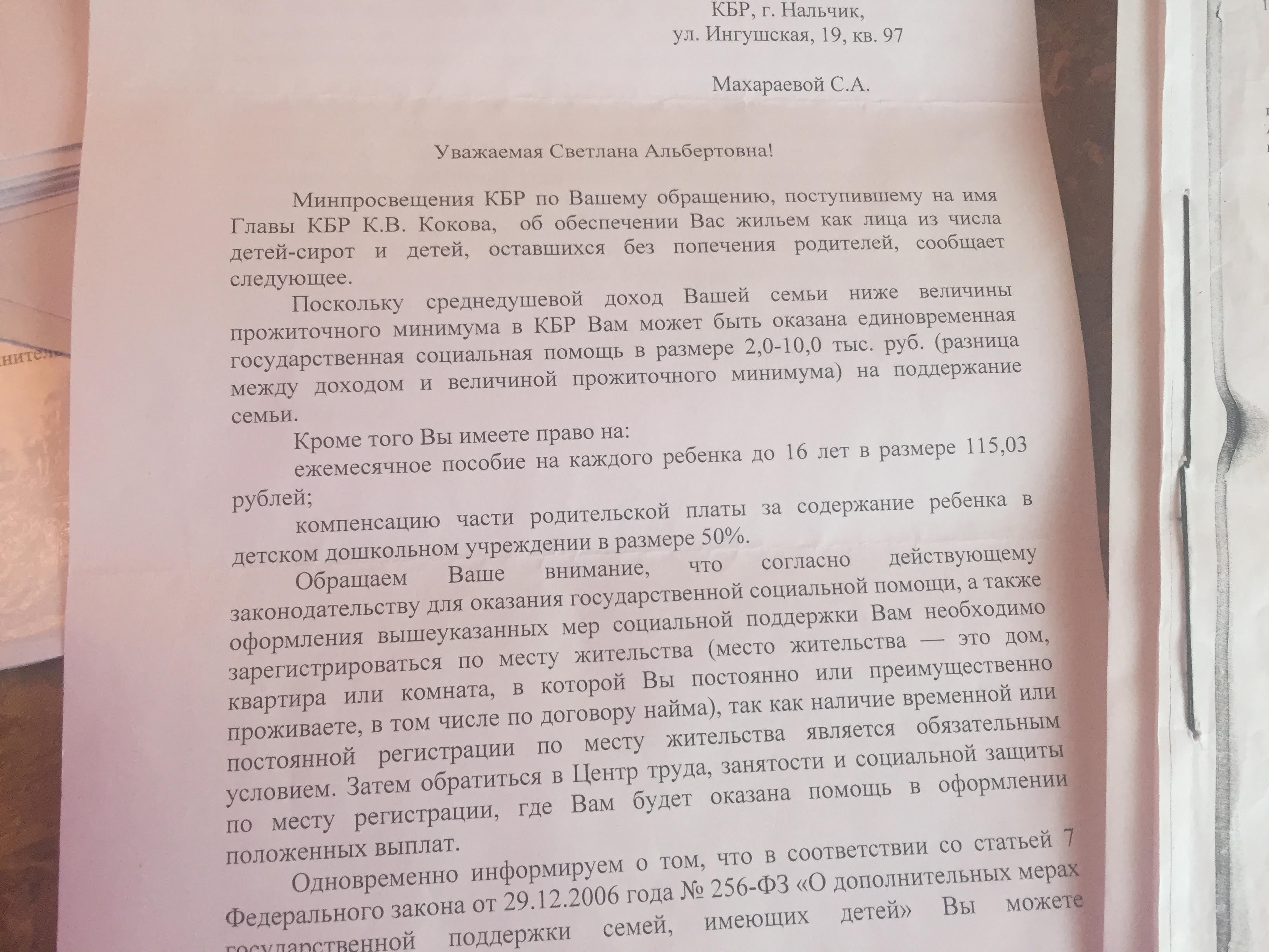 На заявления Гегиевой в различные инстанции, и в частности в последнем ответе от 25 сентября 2019 года, Минобразования КБР  пишет,  что она состоит в республиканском сводном списке детей–сирот под номером 264, и жилье будет предоставлено «в порядке очередности с учетом предусмотренных в последние годы средств республиканского бюджета и субсидий из федерального бюджета на эти цели».