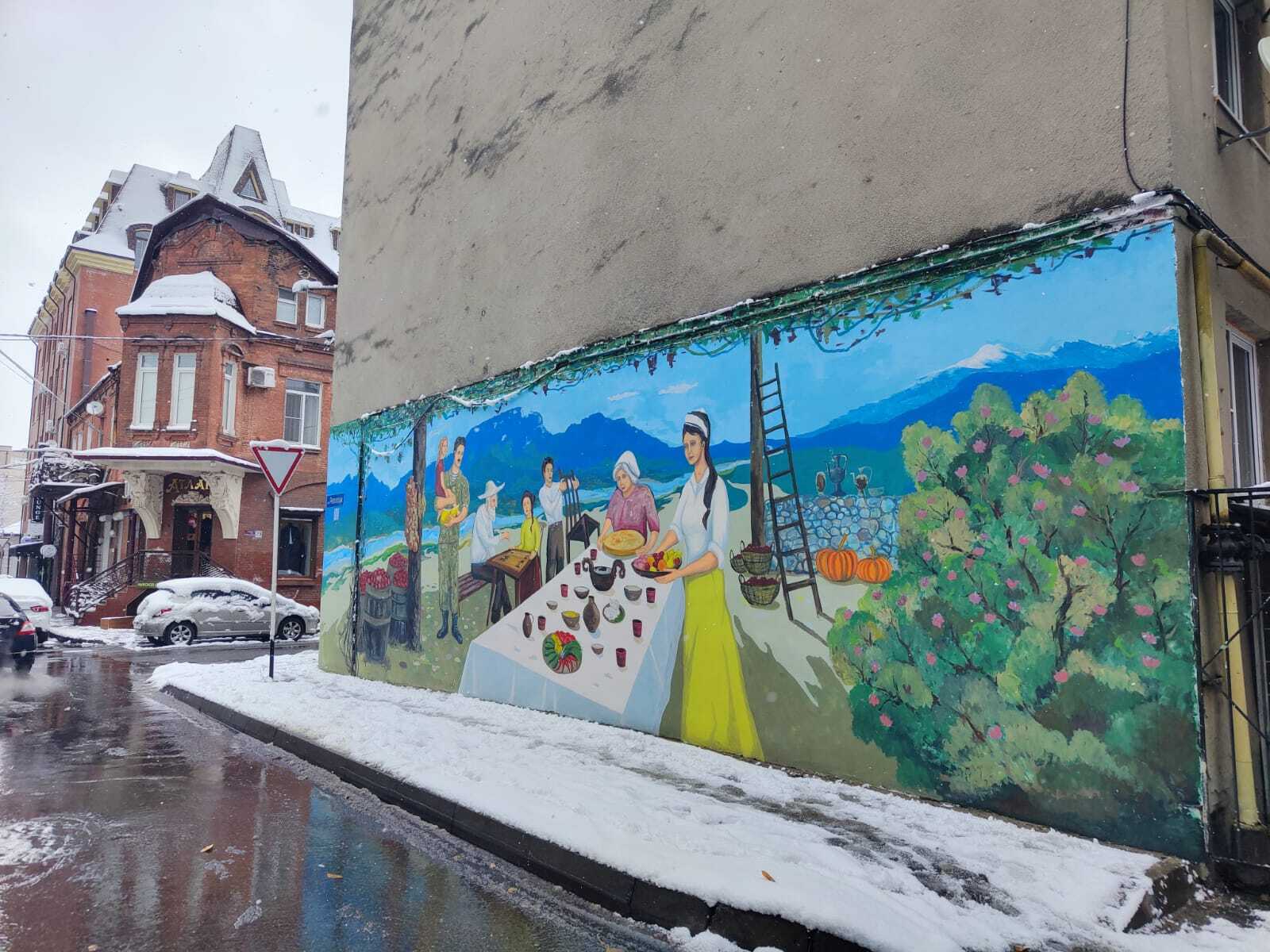 новый стрит-арт во Владикавказе изображает традиционную семью