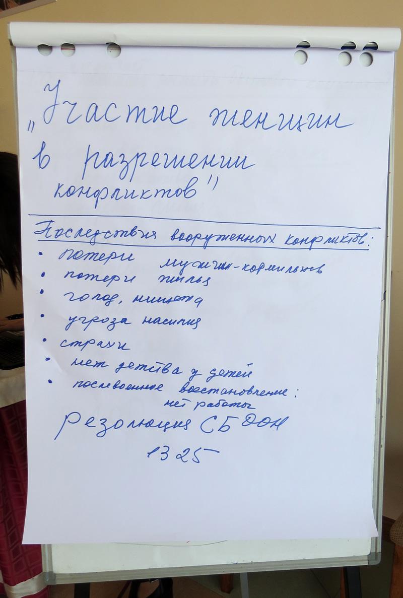 В рамках этого проекта сегодня мы провели тренинг «Участие женщин в разрешении конфликтов». После недолгих раздумий я решил пригласить нашего хорошего друга, коллегу-НПОшницу, опытного тренера Жанну Крикорову, с просьбой провести это мероприятие и, естественно, не ошибся...