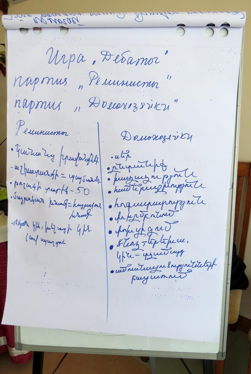 Очень интересно прошла игра «Дебаты»: Жанна разделила участников на две группы с радикально разными взглядами: «домохозяйки» и «феминисты». Я снял видеоролик...