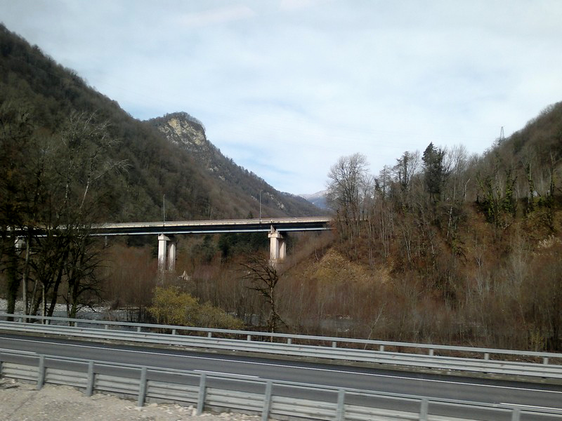 Вид из окна электропоезда «Ласточка» на участок совмещенной скоростной автомобильной и железной дороги Адлер - Красная Поляна, построенной к Олимпиаде.