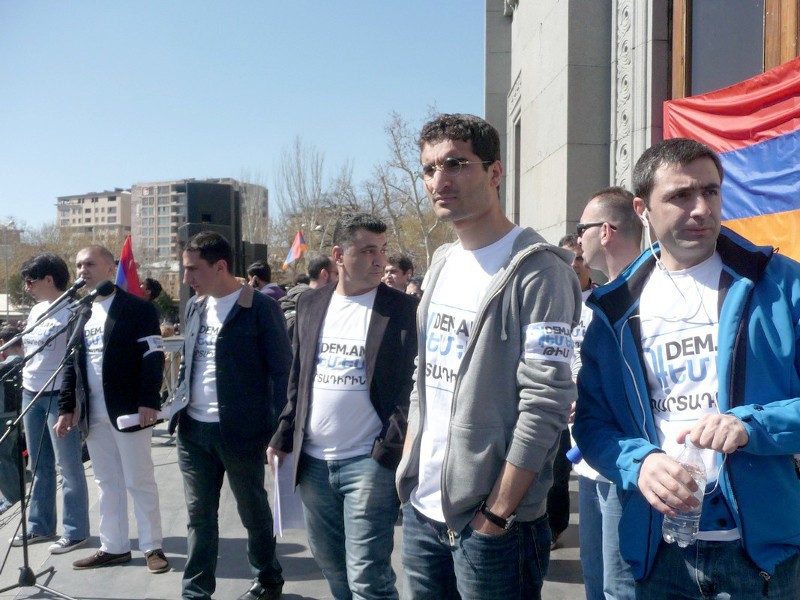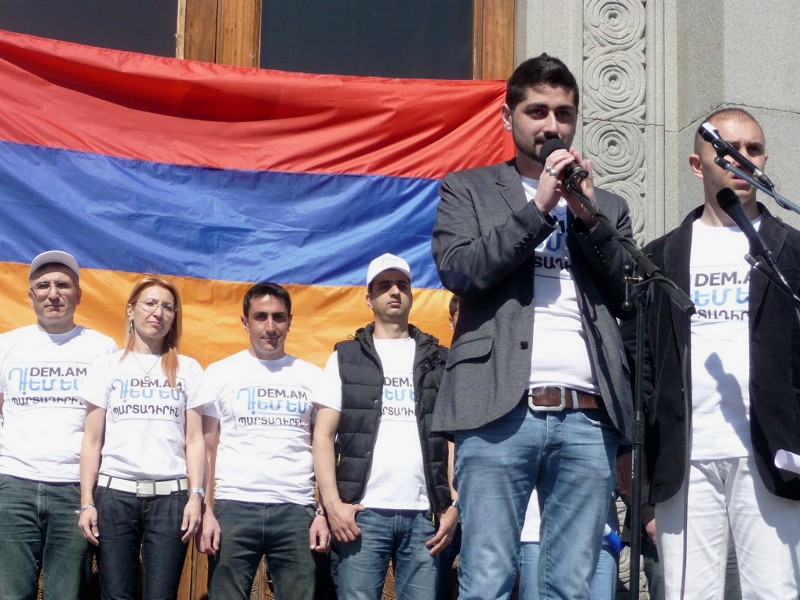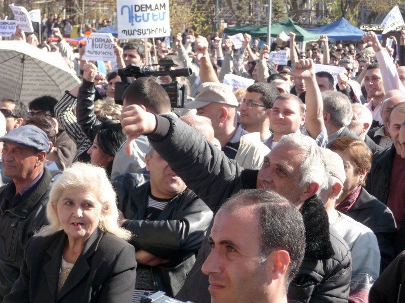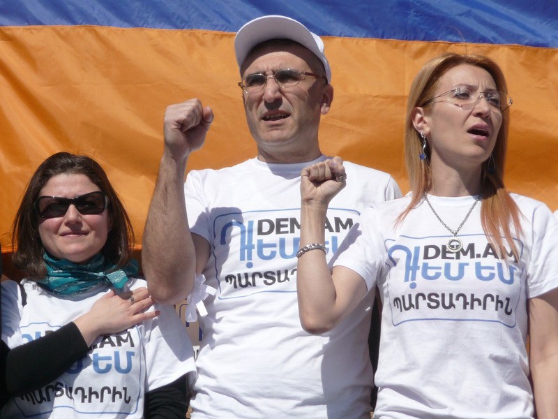 Участникам митинга были розданы листовки с надписью «DEM.AM» («Я против»).