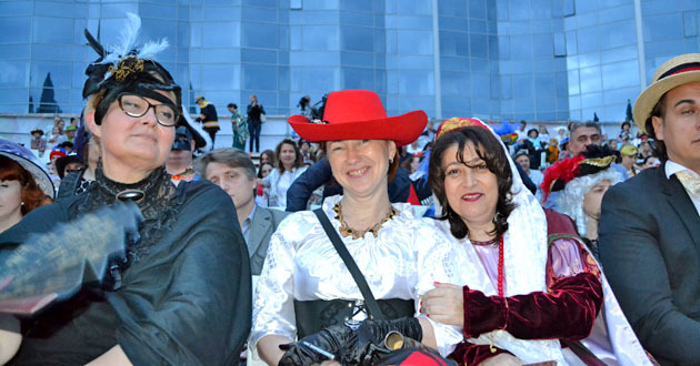 Сотрудники администрации в карнавальных костюмах (слева направо) Элина Баранская –главный художник города, Ольга Медведева – начальник управления образования и науки, Рузана Барсигян - начальник управления культуры Сочи