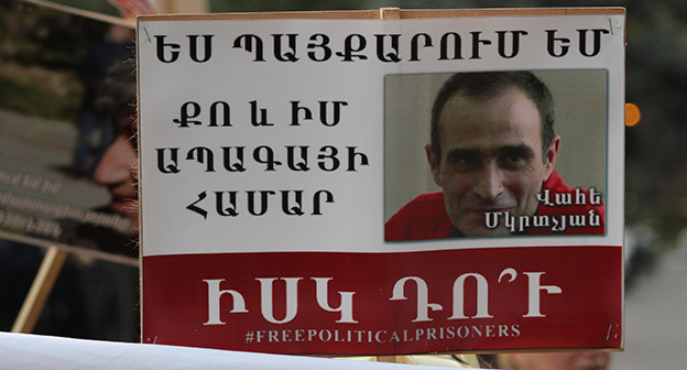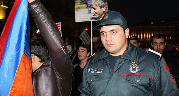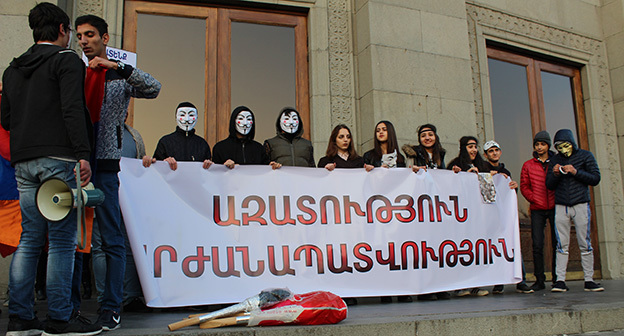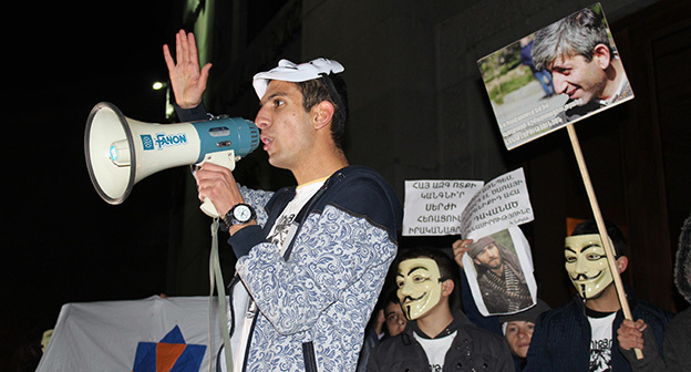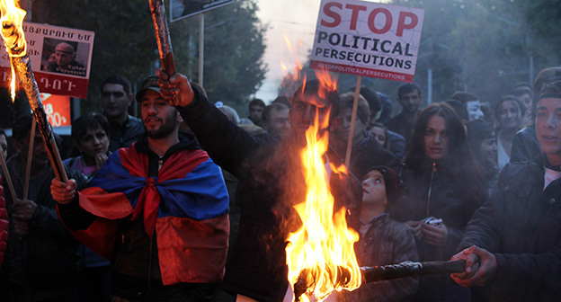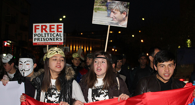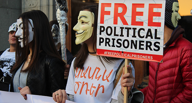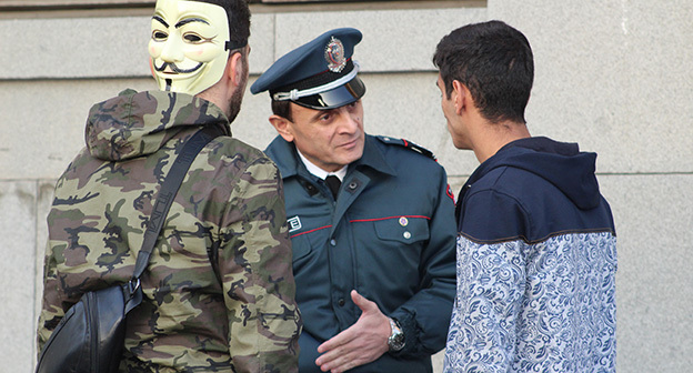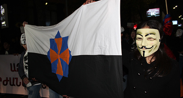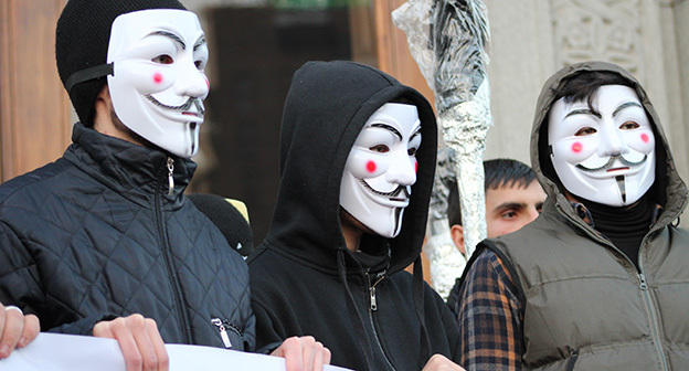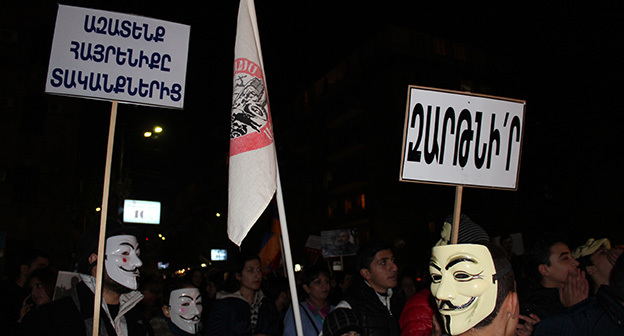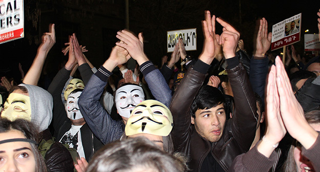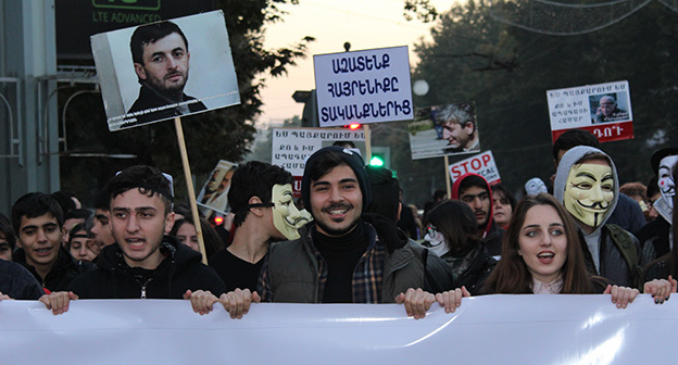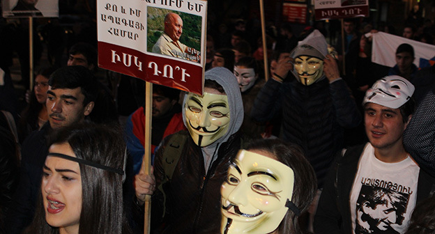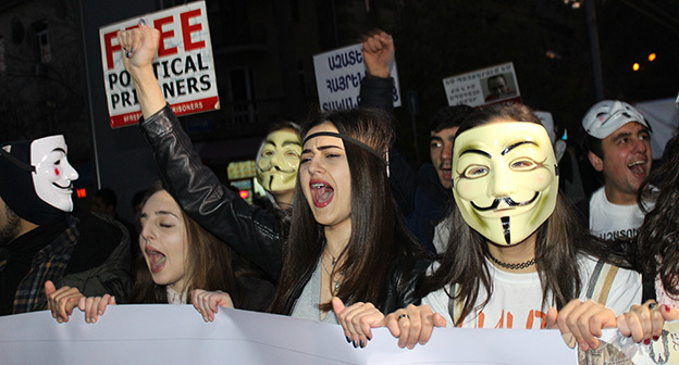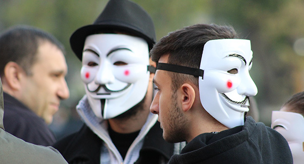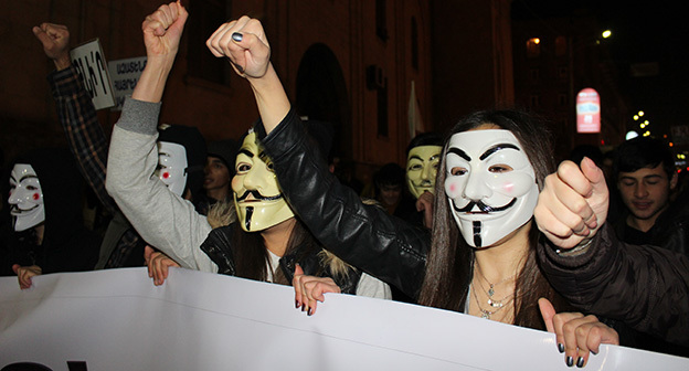 “Серж – уходи!”, “Мы – хозяева страны!”, “Продажный КГБ!” – такие лозунги красовались на транспарантах и звучали из толпы демонстрантов на улицах Еревана в третью годовщину “Марша миллиона масок”. 5 ноября около 300 человек – многие в так называемых масках Гая Фокса, некоторые с факелами – протестовали против политических репрессий. В отличие от 2013 года в этот раз обошлось без массовых потасовок с полицией. После компромиссной беседы с силовиками факелы символично тушили из огнетушителей, а в небо запускали воздушные шары. Наглядно – в фоторепортаже корреспондента “Кавказского узла”.
