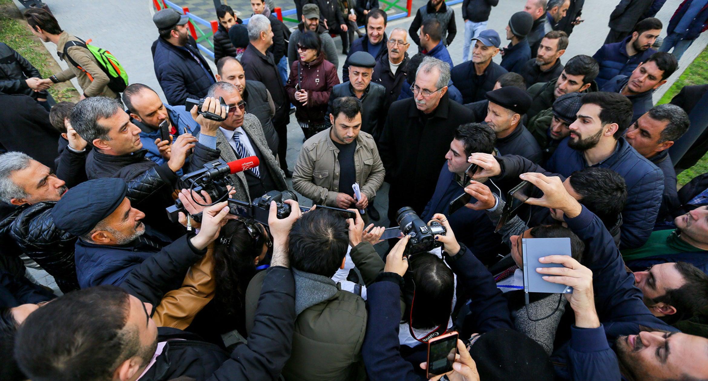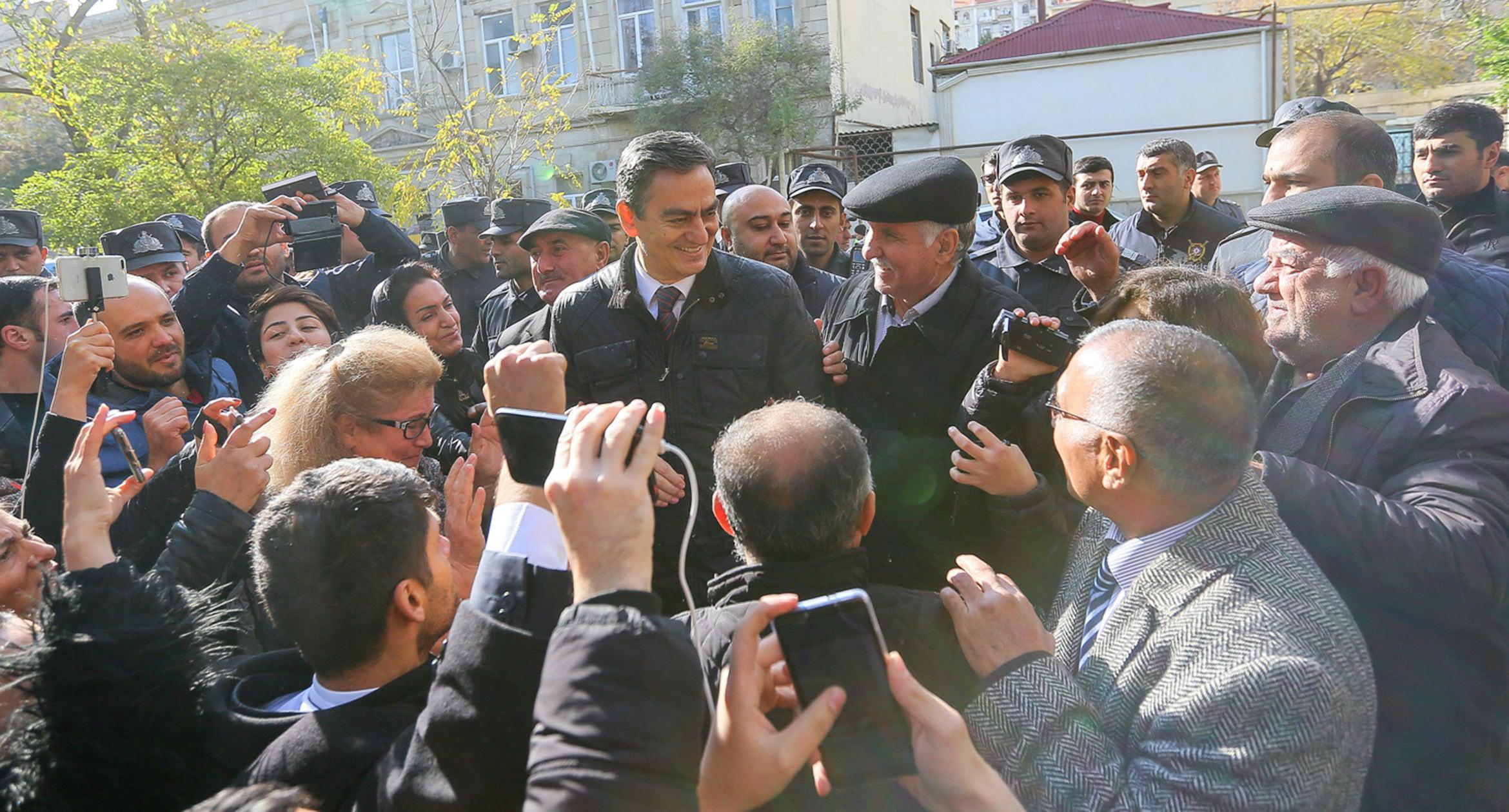 В Баку 17 ноября по случаю Дня национального возрождения оппозиция организовала шествие. Однако провести его мирно не удалось: полиция жестко пресекла акцию. В числе задержанных оказались более 50 человек, среди них лидер партии Народного фронта Азербайджана Али Керимли и глава Нацсовета демократических сил Азербайджана Джамиль Гасанли. Такая реакция властей побудила еще одну акцию: вечером того же дня около 100 активистов собрались у здания Сабаильского районного управления полиции, требуя освободить задержанных. Участников стихийной акции силовики принудительно посадили в автобус и вывезли примерно на два километра от места проведения акции, после чего отпустили. После этого были освобождены около 40 активистов, задержанных во время шествия. 11 человек вместе с Керимли были обвинены в нарушении правил массовых акций. 19 ноября трое участников оппозиционного шествия были арестованы судом на 20 суток, остальные, включая Али Керимли, – оштрафованы. О том, как встречали освобожденных активистов их соратники, фоторепортаж корреспондента «Кавказского узла» Азиза Каримова.