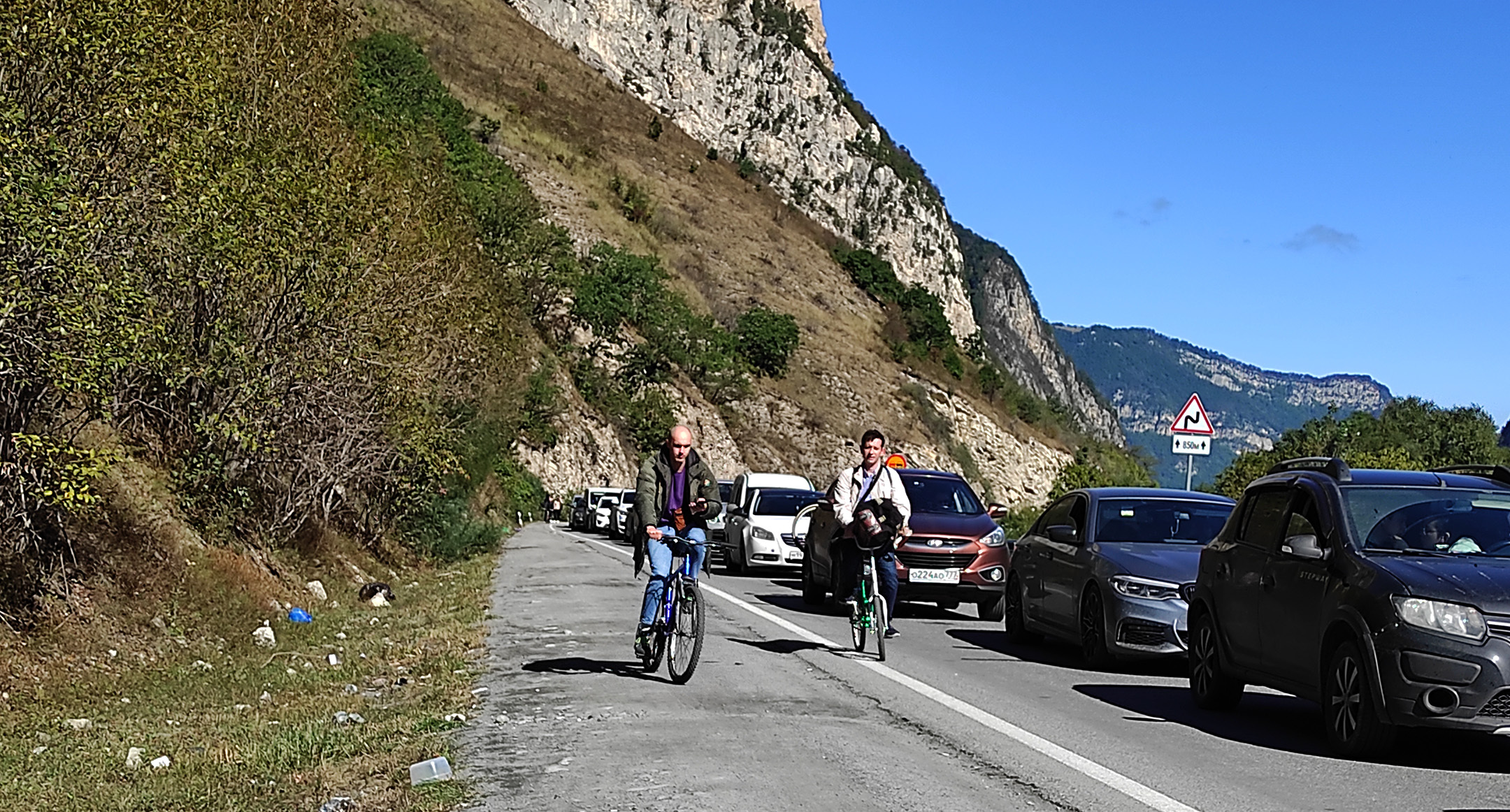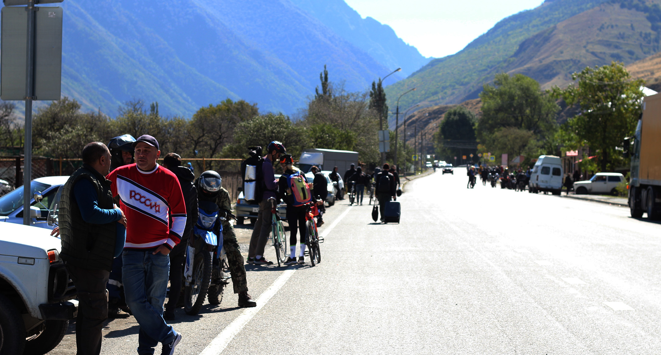 Сложности у туристов начинаются уже выезде из Владикавказа: многокилометровые пробки растянулись на 20 с лишним километров. Ожидать проезда можно много часов. Чтобы не стоять в пробках люди идут до границы пешком или едут на велосипедах, самокатах, мотоциклах и даже скейтбордах.