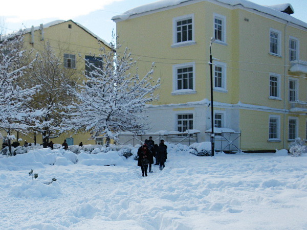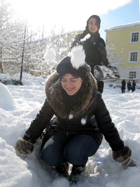 Студенты играют в снежки.